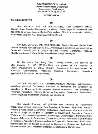 કે.એમ. ભીમજીયાની, આઈ.એ.એસ.ની સ્પીપા આમદવાદથી બદલી સેટલમેન્ટ કમિશનર અને ભૂમિ રેકોર્ડ્સના નિયામક તરીકે નિયુક્ત કરવામાં આવ્યા છે. લાંબા ગાળાના તાલીમ વિદેશથી પરત ફર્યા બાદ સ્વરૂપ પી., આઈએએસને વડોદરાના વડોદરાનાં મ્યુનિસિપલ કમિશ્નર તરીકે નિયુક્તિ આપી છે. તો વડોદરાના કમિશ્નર એન.બી. ઉપાધ્યાય, આઈએએસને સરકારના સચિવ (સહકાર, પશુપાલન, ગાય સંવર્ધન અને મત્સ્યઉદ્યોગ), કૃષિ, ખેડૂત કલ્યાણ અને સહકાર વિભાગમાં નિયુક્તિ મળી છે.